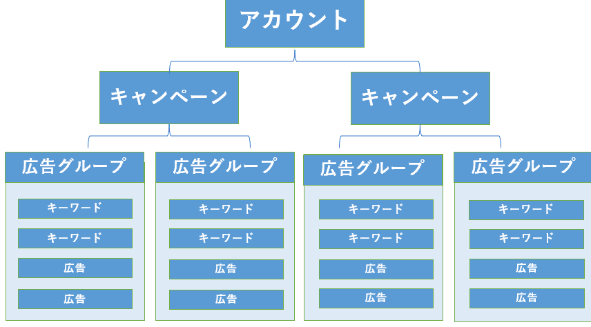 リスティング広告は以下の階層で構成されています。