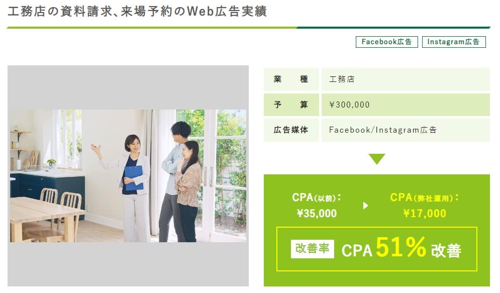 Web広告運用の専門企業「グローストリガー株式会社」が手掛けた事例では、ある工務店がFacebookやInstagram広告を運用していた際、期待していた成果が得られず、広告の費用対効果に課題を抱えていたとのこと。